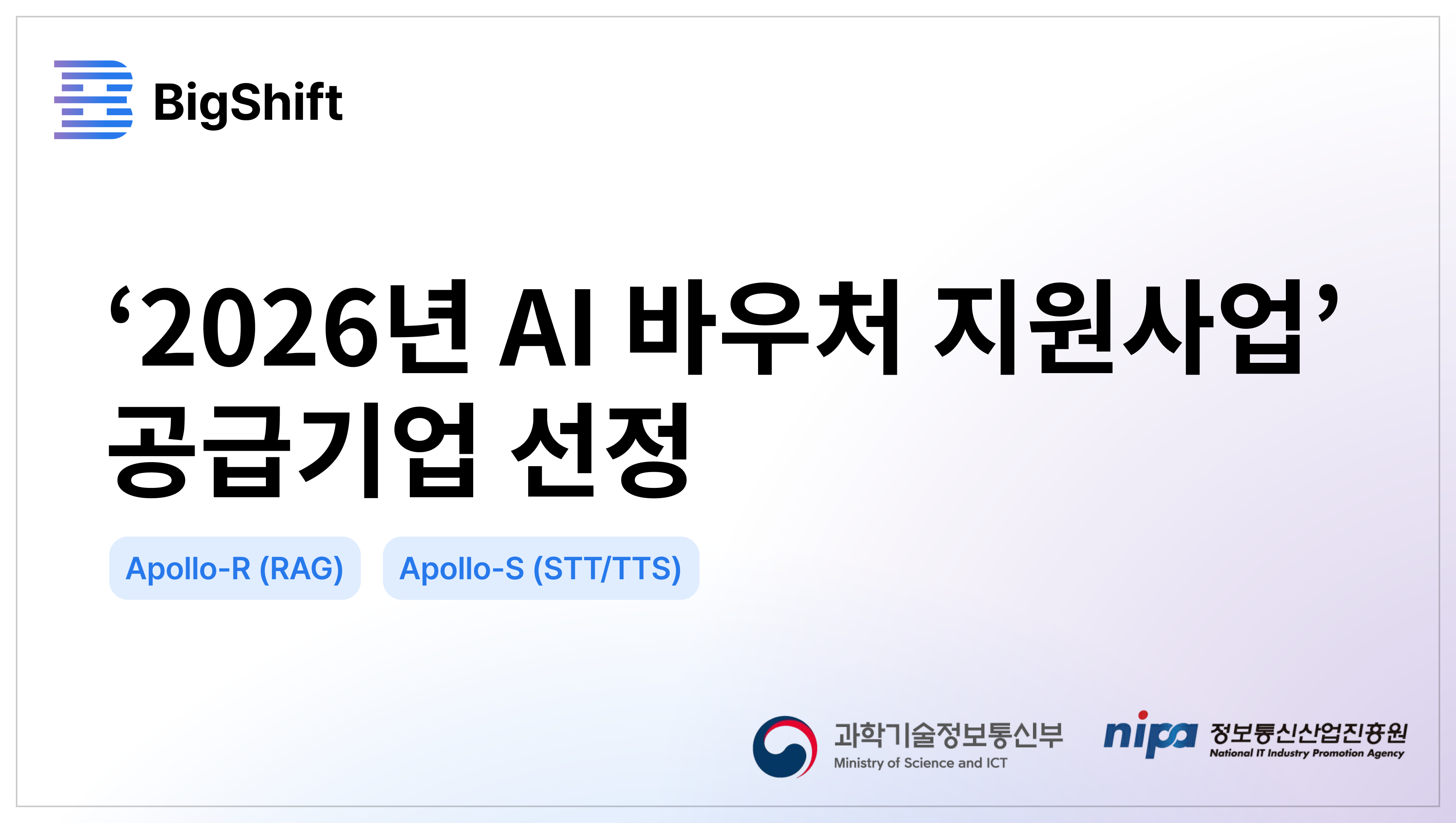 ‘2026년 AI 바우처 지원사업’ 공급기업으로 선정된 빅시프트가 음성 AI ‘Apollo-S’와 RAG 챗봇 ‘Apollo-R’을 중심으로 공공·의료·교육 시장 공략에 나선다.